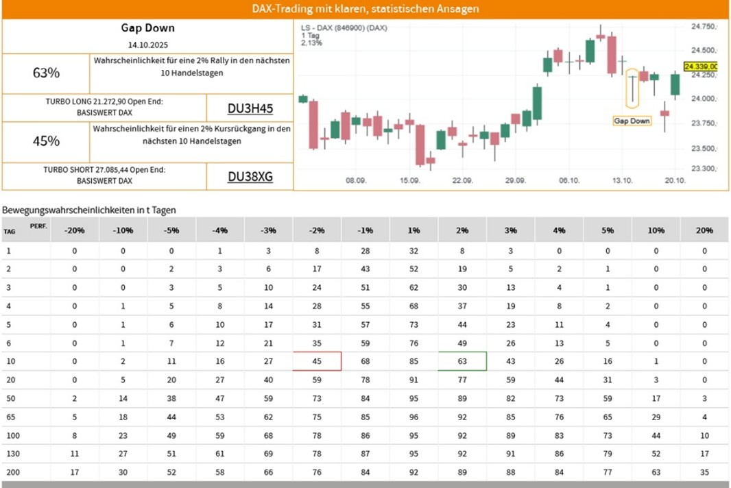 Die Erfolgswahrscheinlichkeiten für das Signal "Gap Down" beruhen auf einer historischen Auswertung des Signals auf den LS-DAX im Zeitraum vom 02.01.2000 bis zum 20.10.2025. Dabei wurden die folgenden Voreinstellungen und Filter vorgenommen: