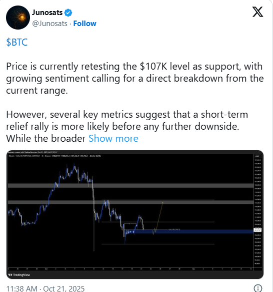 Die Kursentwicklung von Bitcoin bleibt weltweit im Mittelpunkt der Aufmerksamkeit, während die Anlegergemeinde im Bereich von 107.000 Dollar auf die nächste wichtige Bewegung wartet. Nach einer volatilen Woche liegt der BTC-Preis bei etwa 107.000 Dollar und tritt auf der Stelle, nachdem dieses Niveau als kleinere Unterstützung getestet wurde. Während es einige Spekulationen über einen Ausbruch aus der Handelsspanne gab, deuten viele On-Chain- und technische Kennzahlen auf das Potenzial einer Erholungsrally hin, bevor eine weitere Korrektur erfolgt.