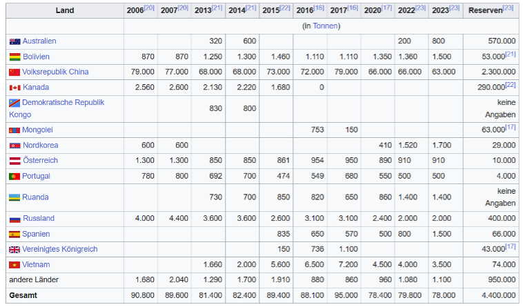 Und die Macht und das Gewicht Chinas gerade im Bereich Wolfram und REE ist nicht zu unterschätzen, mit einer Wolfram-Produktion von 63.000 Tonnen. Damit liegt der Anteil an der weltweiten Gesamtproduktion von gerade einmal 78.000 Tonnen bei fast 81%!