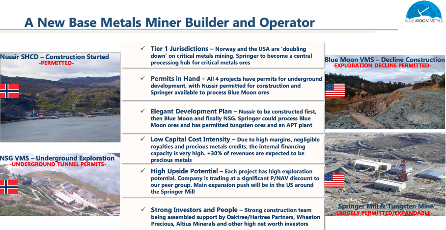 Die Lagerstätte enthält laut NI 43-101 eine etwa 2,7 Mio. Tonnen gemessene, 26 Mio. Tonnen angezeigte sowie 32 Mio. Tonnen geschlussfolgerte Kupfer-Ressourcen. In den 1970er-Jahren wurde in der Region bereits Kupfer im Tagebau gefördert. Blue Moon übernahm das Projekt im Februar 2025 von Nussir ASA, das über zwei Jahrzehnte lang an der Erschließung arbeitete. Zusätzlich wurden im März 2025 Hafenanlagen, Abbauinfrastruktur und weitere Konzessionsflächen erworben. Der Standort bietet Zugang zu Wasser, günstiger erneuerbarer Energie und nahegelegenen Handelshäfen