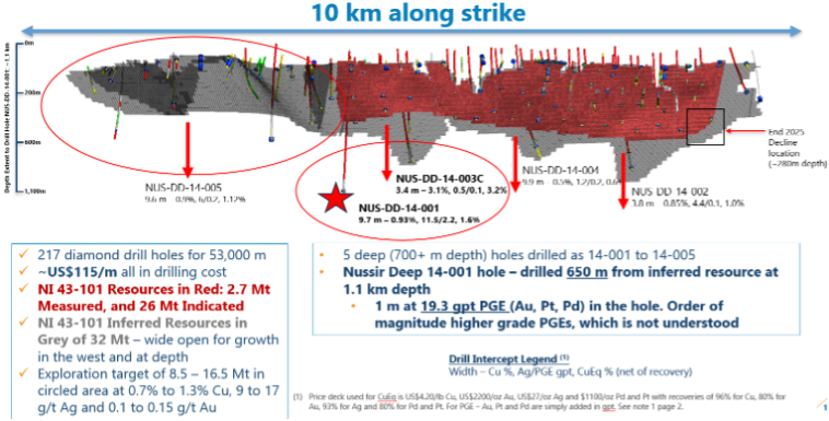 Blue Moon sieht großes Potenzial zur Erweiterung der Ressourcenbasis im Nussir-Projekt. Geplant ist die genauere Erkundung unzureichend gebohrter Zonen entlang eines 10 km langen Trends sowie hochgradiger Bereiche mit über 2% Kupferäquivalent.