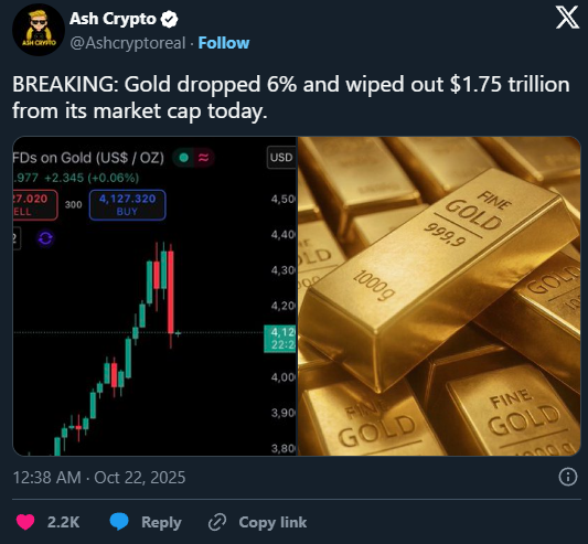 Der Goldpreis hat in den letzten Tagen einen überraschenden Einbruch erlebt. Innerhalb von nur 24 Stunden verlor das Edelmetall rund 6% an Wert, was einen Abzug von etwa 1,75 Billionen Dollar Marktkapitalisierung bedeutet - der größte Tagesverlust seit August 2020. Nach einer monatelangen Rekordrallye, die Gold auf ein All-Time-High von 4.380 Dollar pro Feinunze getrieben hatte, fragen sich nun viele Anleger, ob damit der Wendepunkt erreicht ist und ob dieser Rückgang den Startschuss für einen neuen Bitcoin-Aufschwung darstellen könnte.