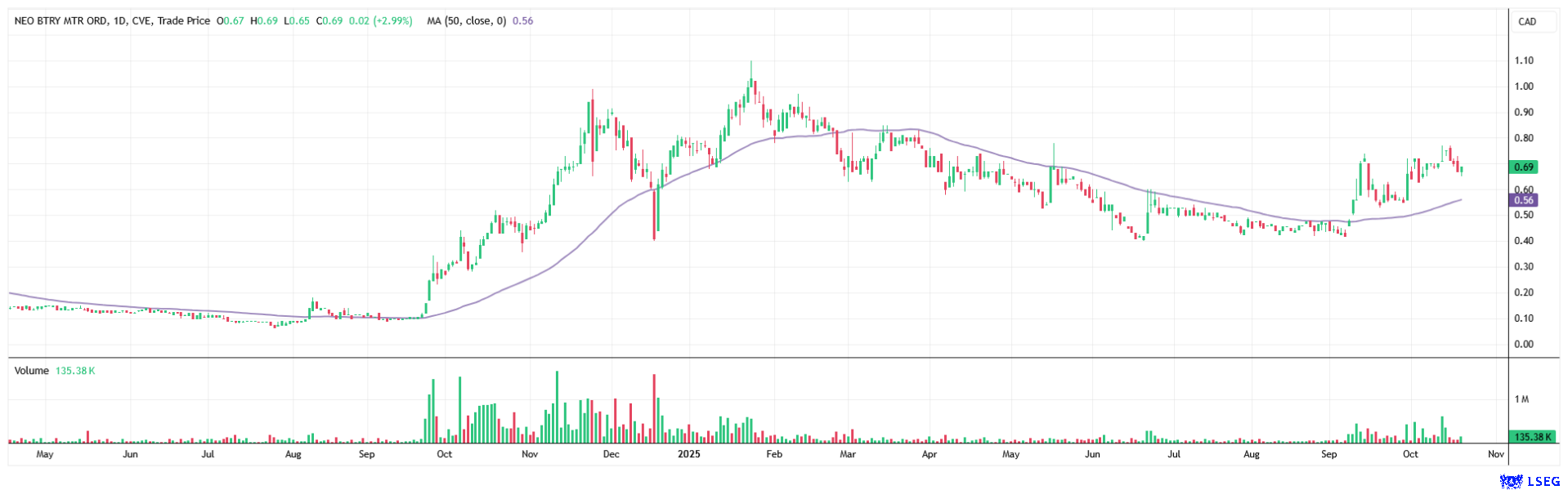 Operativ hat das junge Unternehmen zuletzt gleich zwei wichtige Meldungen bekanntgegeben. Erstens sicherte man sich in Südkorea eine Fabrik, um dort seine Produkte herstellen zu können. Südkorea gilt als bei Batterietechnologie führend und ist zudem ein enger Verbündeter der USA. Zu Beginn der Woche dann die nächste Meldung: NEO Battery Materials hat einen Auftrag mit einem Gesamtvolumen von 2,5 Mio. CAD von einem südkoreanischen Anbieter von Industrierobotern erhalten. Dass NEO Battery Materials auf dem Heimatmarkt von Samsung und Co. mit seiner Technologie überzeugen kann, darf als Ritterschlag gelten und unterstreicht die großen Ambitionen des kanadischen Unternehmens.