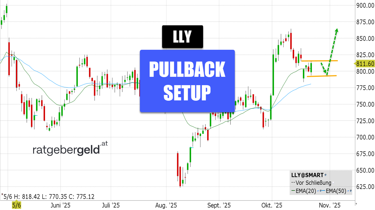 Rückblick: Nach eine längeren Abverkaufsphase gab es zuletzt mit dem Schließen des Gap Down vom August, der Rückkehr auf die Oberseite der gleitenden Durchschnitte und der Pullback-Formation der letzen beiden Handelswochen starke Anzeichen, dass die Bullen bei der Eli-Lilly-Aktie wieder an Bord sind. Auch die Mutterkerze vom gestrigen Mittwoch spricht tendenziell für weiter steigende Kurse.