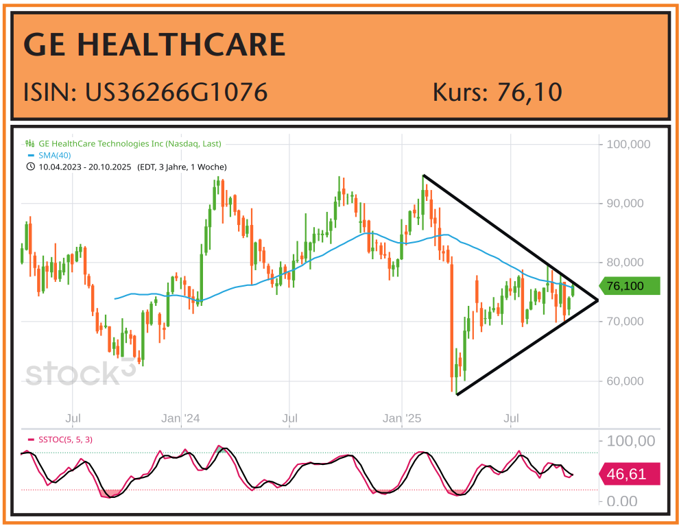 GE HEALTHCARE ist eine der großen Medtech-Adressen und ehemals Teil von GENERAL ELECTRIC als Ganzes. Nach rd. 20 % Korrektur kosten 17 Mrd. $ Umsatz zurzeit 28 Mrd. $ Marktwert. Der Gewinntrend ist sehr solide von 2,97 $ je Aktie in 2023 bis 4,18 $ als Taxe für das kommende Jahr. Das ergibt ein KGV von weniger als 15.