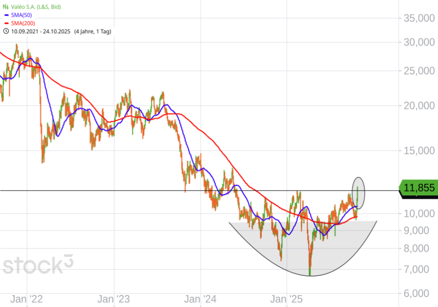 Dennoch bestätigte das Management die Jahresziele und rechnet weiterhin mit rund 20,5 Mrd. € Umsatz sowie einer operativen Marge zwischen 4,5 und 5,5 %. Auch der freie Cashflow soll solide bleiben. Die Analysten von JPMorgan sehen Valeo auf Kurs und halten an ihrer Einstufung "Overweight" mit einem Kursziel von 22 € fest. Das wäre ein Verdoppler. Ich verweise auf unsere Lupe im Aktionärsbrief aus AK 37/25 https://www.bernecker.info/release/view?id_release=7095&keyword=Valeo vom 10. September. Die europäischen Zulieferer werden unterschätzt. Der Valeo-Chart signalisiert die Trendwende.