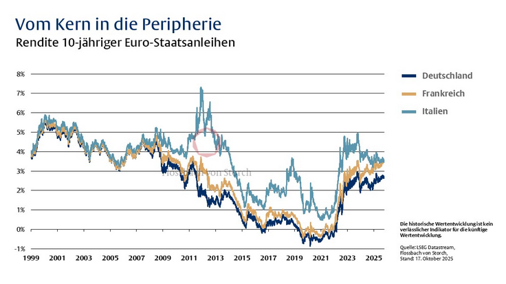 Am 9. September 2025, um 08:54 Uhr, ereignete sich Historisches in der Geschichte der Eurozone. Kurz vor Beginn des Börsenhandels auf dem europäischen Festland notierten zehnjährige französische Staatsanleihen bei einer Rendite von 3,48 Prozent und damit marginal höher als ihre italienischen Pendants. Seit Einführung der Gemeinschaftswährung 1999 ist es noch nie vorgekommen, dass der französische Staat höhere Zinsen an seine Gläubiger zahlen musste als der italienische. Wie konnte es so weit kommen, dass das Kernland Frankreich renditeseitig einen ehemaligen Vertreter der Euro-Peripherie überholt?