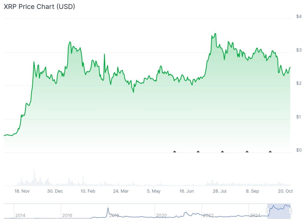 Der Ripple-Coin hat innerhalb der letzten 24 Stunden wieder eine deutliche Erholung erfahren. Seit gestern ging es um 4,16 % aufwärts. Damit tradet XRP nun wieder über der 2,50-$-Marke und gehört zudem zu den 5 bestperformenden Kryptowährungen unter den Top 100 Coins nach Marktkapitalisierung. XRP hatte vor allem Ende 2024 durch den Wahlsieg von Donald Trump in den USA eine starke Rallye von 0,50 $ auf über 3,00 $ erlebt, bevor eine Konsolidierungsphase einsetzte.