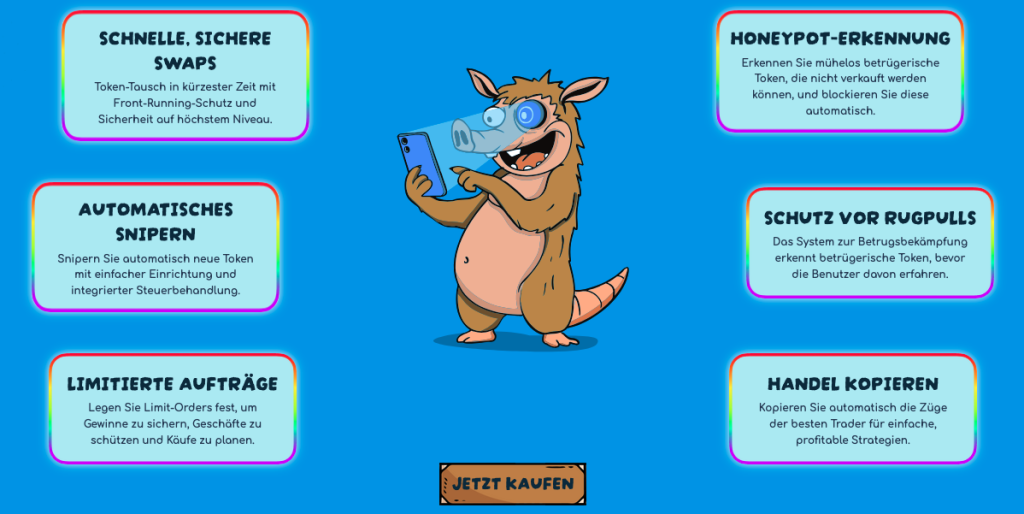 Spannend an Snorter ist neben der nativen Kryptowährung vor allem der Snorter-Bot. Dies ist ein Telegram-Trading-Bot, der es ermöglicht, Kryptowährungen direkt in der Telegram-App im Chat zu traden. Um sich gegen etablierte Konkurrenten wie BonkBot oder BananaGun durchzusetzen, setzt der Snorter-Bot auf die Solana Virtual Machine. Auf dieser aufbauend können Trades hier in unter einer Sekunde abgewickelt und für nur 0,85 % Gebühren durchgeführt werden. Das macht den Snorter-Bot vor allem für kurzfristig orientierte Trader spannend.