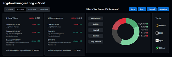 Aktuellen sind allerdings laut den Angaben von CoinGlass 56 % der Investoren bullisch und 18 % sogar extrem bullisch, während es nur 22 % Bären und 9 % Extremisten sind. Trotzdem ist der Short-Anteil der Positionen mit 65,05 % derzeit höher, was zeigt, dass das Bedürfnis für Absicherungen aufgrund des Handelskrieges und Krieges trotzdem noch hoch ist.