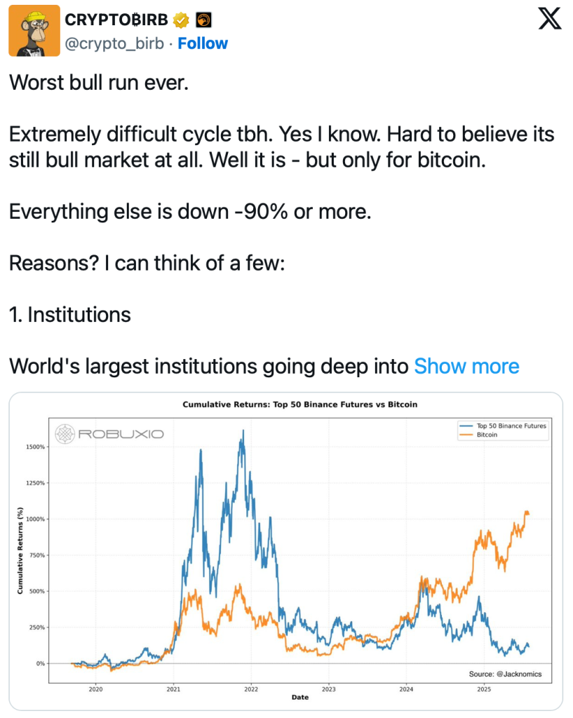Ein erfahrener Krypto-Analyst schlägt Alarm und bezeichnet den aktuellen Marktumstand als den "schlechtesten Bullenmarkt aller Zeiten". Während Bitcoin sich um die 111.000 US-Dollar stabilisiert hat, zeigt sich der Rest des Kryptomarktes in einer völlig anderen Verfassung. Viele Altcoins notieren dramatische 90 Prozent unter ihren Allzeithochs, und die typische Marktdynamik vergangener Zyklen scheint verschwunden zu sein.