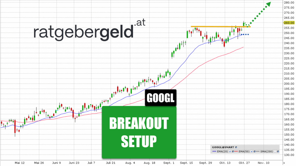 Seit Mai ist ein klarer, intakter Aufwärtstrend der Alphabet-Aktie an der stetig steigenden Kursbewegung über den gleitenden Durchschnitten erkennbar. Seit September hat sich der Kurs in einer Konsolidierungsphase eingependelt. Der Ausbruch über 255 USD hat ein technisches Kaufsignal ausgelöst.