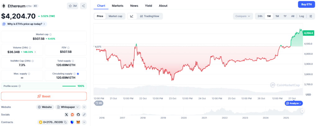 Ethereum sorgt zum Wochenstart für Dollarzeichen in den Augen der Investoren. Nach mehreren Tagen zäher Seitwärtsbewegung legte der zweitgrößte Coin in den letzten 24 Stunden um 6,3 Prozent zu und durchbrach dabei erstmals seit Wochen die Marke von 4.200 US-Dollar. Auch Bitcoin zog mit und testete erneut die Region um 115.000 US-Dollar, während viele Altcoins von dem positiven Momentum profitierten.