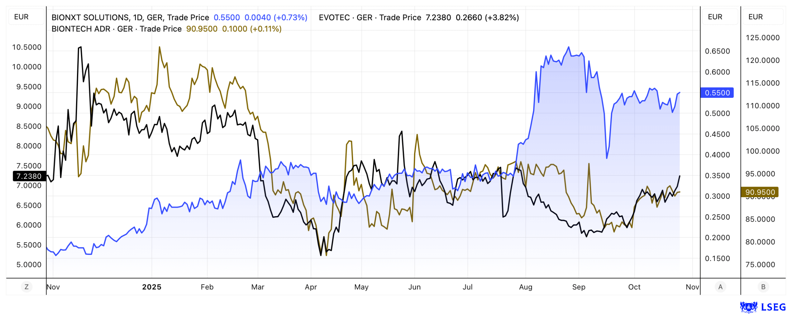 Die BioNxt-Aktie befindet sich im Aufwärtstrend. Quelle: LSEG vom 27.10.2025