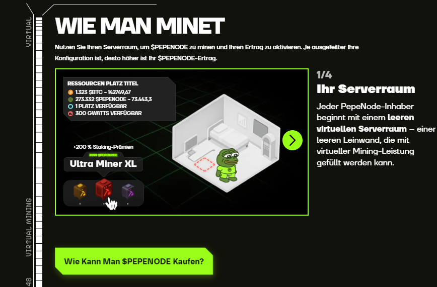 Ein anderes auf Ethereum basiertes Projekt könnte in den nächsten Wochen allerding deulich bessere Steigerungen bieten. PepeNode ($PEPENODE) will mit einem neuartigen Ansatz das Krypto Mining spielerisch in die breite Masse bringen, und das ohne den enormen Energieaufwand, der beim klassischen Mining benötigt wird.