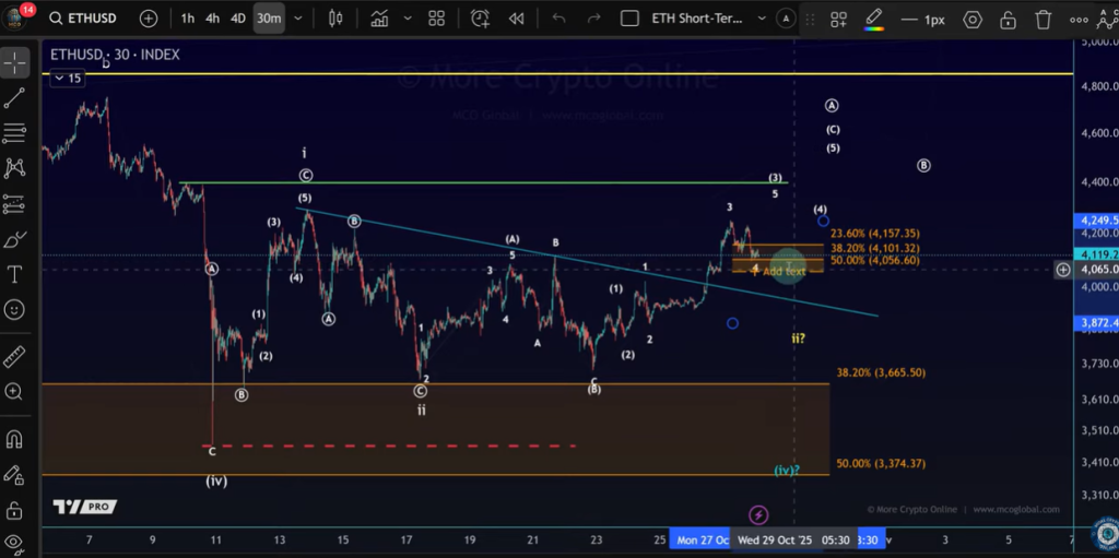 Die aktuelle Struktur folgt einem typischen Marktverhalten, das oft vor einem neuen Aufwärtsschub zu beobachten ist. Nach längerer Konsolidierung entsteht Druck, der sich irgendwann in eine klare Richtung entlädt. Laut der Elliott-Wellen-Theorie könnte Ethereum sich gerade in einer sogenannten vierten Welle befinden, also einer ruhigen Phase zwischen zwei großen Bewegungen. Sollte sich diese Annahme bestätigen, wäre der nächste Anstieg die fünfte Welle und die hat es oft in sich.