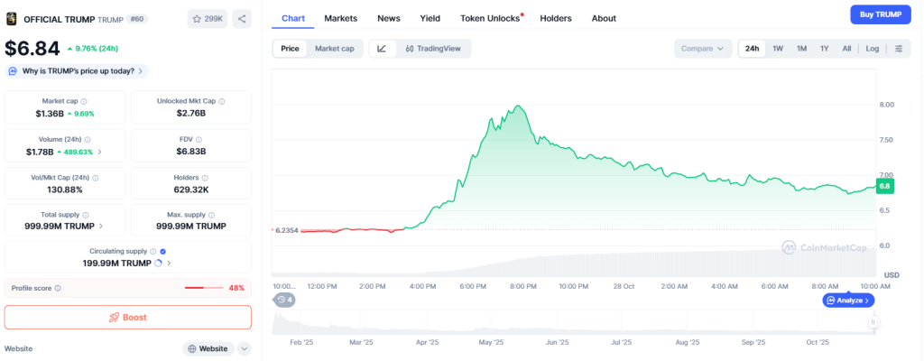 Altcoins zeigen zum Wochenstart hohe Volatilität. Besonders der Official Trump TRUMP zog in den letzten 24 Stunden kräftig an, kletterte zeitweise über 8 US-Dollar und fiel anschließend wieder auf rund 6,8 US-Dollar zurück. Trotz dieser Schwankung bleibt das Interesse hoch, denn TRUMP konnte sich klar über der wichtigen Supportzone bei 6,2 US-Dollar halten.