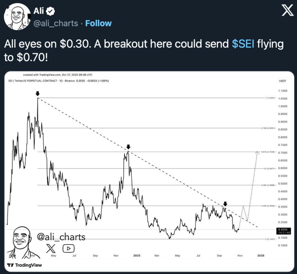 Trotz der zuletzt schwachen Kursentwicklung zeigt sich der renommierte Analyst Ali Martinez jedoch optimistisch, was die Zukunft von SEI betrifft. Über die letzten Jahre hat sich ihm zufolge eine Widerstandslinie bei den Zyklushöchstständen gebildet. Die liegt aktuell bei rund 0,30 $. Falls es den SEI-Bullen im Zuge einer möglichen Endjahresrallye gelingt, diese Widerstandsmarke zu durchbrechen, könnte es laut Martinez zu einer größeren Rebound-Rallye auf bis zu 0,70 $ kommen.