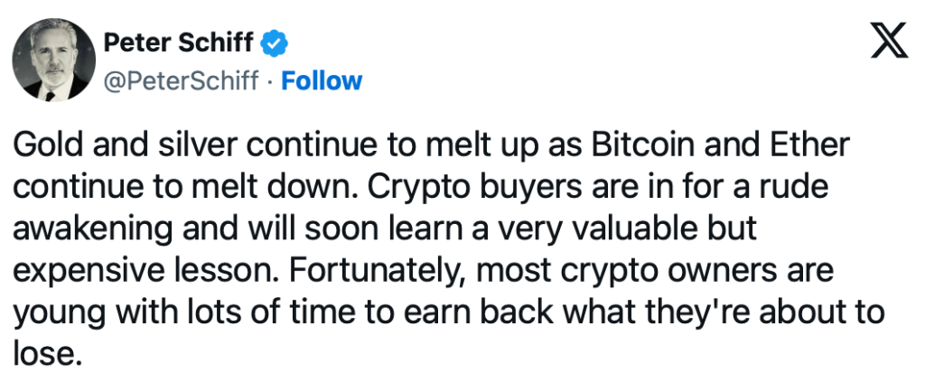 Peter Schiff gilt allgemein als Bitcoin-Bär und äußert sich seit Jahren pessimistisch gegenüber der Kryptowährung. Auf der Social-Media-Plattform X schrieb er kürzlich: "Der Bitcoin-Crash vom Freitag war keine Kaufgelegenheit, sondern eine Warnung. Beim nächsten Einbruch kann selbst Trump ihn mit keinem Social-Media-Post retten." Dabei verwies Schiff darauf, dass die Kryptomärkte kurz davorstehen würden, in eine Korrektur abzurutschen.