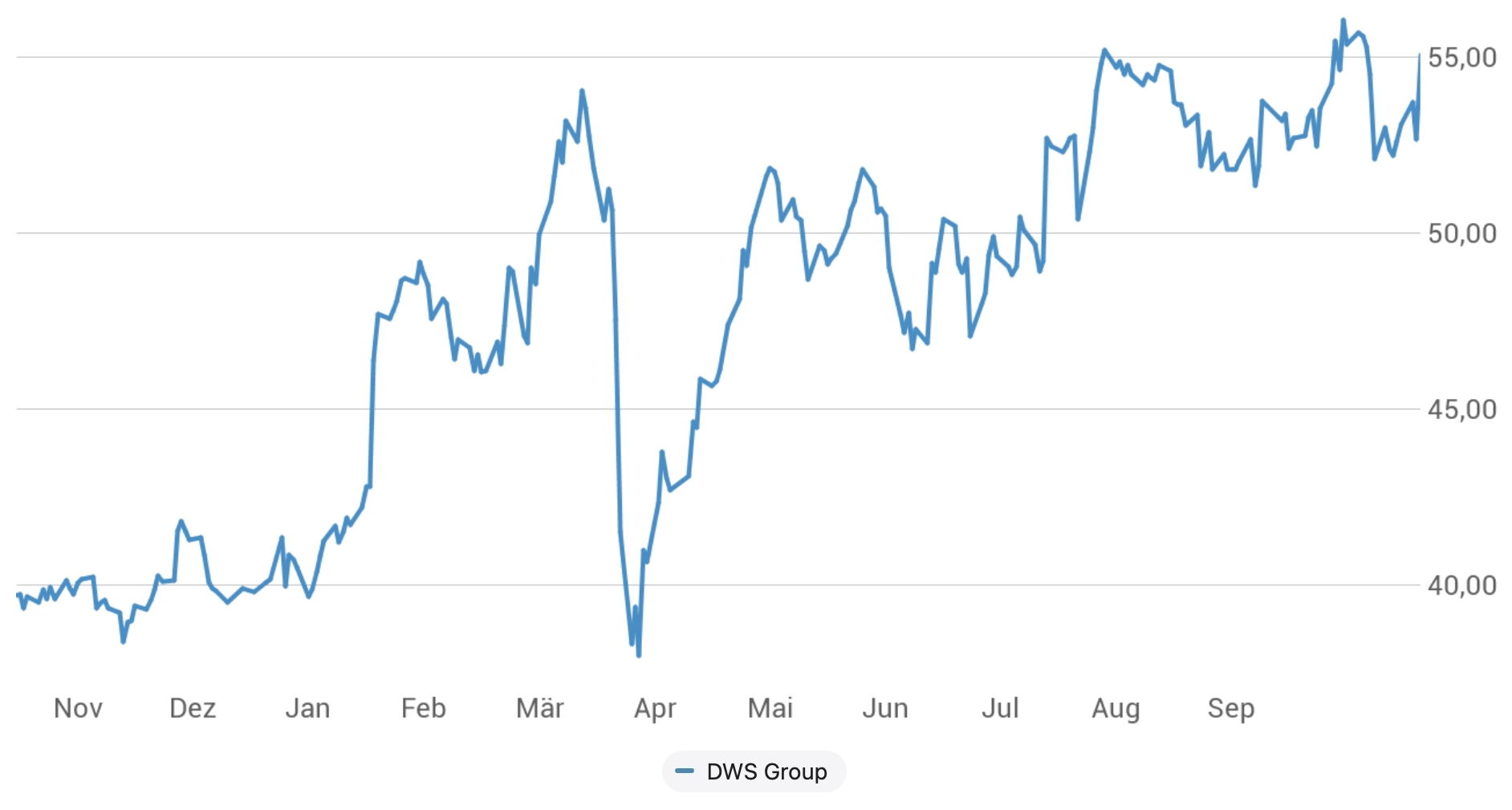 Die Fondstochter der Deutschen Bank präsentierte gestern bei der Vorlage der Q3-Zahlen gestiegene Nettomittelzuflüsse (+ 25,7 Mrd. € auf Neun-Monats-Basis). Außerdem verbesserten sich die Aufwand-Ertrag-Relation, der Vorsteuergewinn und das Konzernergebnis (+ 34 % auf Neun-Monats-Basis) sowohl im Quartalsvergleich als auch im Vergleich zu den ersten neun Monaten 2024. Damit erreichte die DWS ihr zweitbestes Finanzergebnis für ein Quartal sowie ihr bestes Finanzergebnis auf Neun-Monats-Basis. Dank dieser starken Performance bestätigte DWS-Chef Stefan Hoops gestern die Jahresziele für 2025 (Ergebnis je Aktie mindestens 4,50 € und Aufwand-Ertrag-Relation von unter 61,5 %). Die DWS-Aktie war gestern mit einem Plus von 4,4 % bester MDax-Wert.