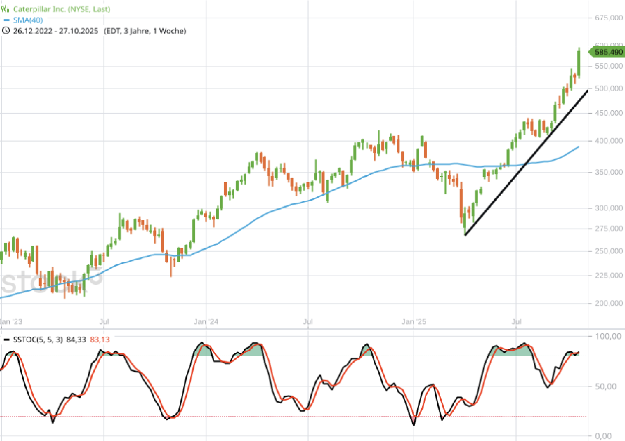 Der Baumaschinenkonzern erreichte im abgelaufenen Quartal einen Gewinn je Aktie von 4,95 $ und lag damit klar über den Analystenerwartungen von 4,51 $. Haupttreiber ist die sprunghaft gestiegene Nachfrage nach Stromerzeugungsgeneratoren für KI-Rechenzentren. Der Umsatz der Sparte Energy & Transportation legte um 17 % im Jahresvergleich zu, während die Bereiche Bau und Bergbau um 7 % bzw. 2 % wuchsen. Die UBS geht davon aus, dass sich der Umsatz mit Stromgeneratoren in den kommenden drei Jahren nahezu verdoppeln wird. Die Aktie quittierte das mit einem Anstieg um ca. 14 % auf ein neues Allzeithoch.