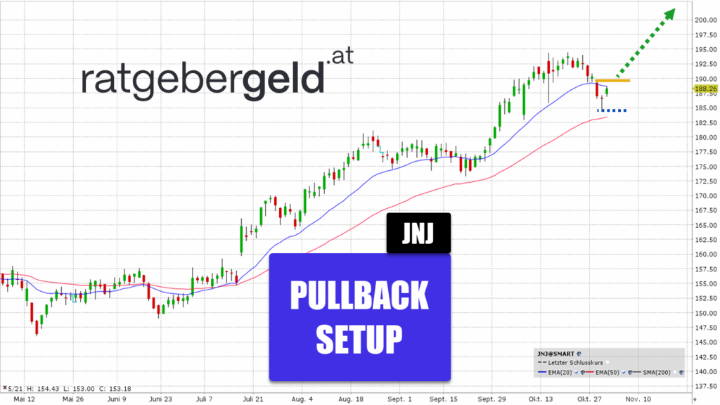 Der weltweit größte Hersteller von Gesundheitsprodukten wird von den Anlegern oft als Dividendenoptionen gewählt. Seit Mitte Juli befindet sich die Aktie in einem klaren Aufwärtstrend, erkennbar an der Reihe höherer Hochs und höherer Tiefs. In den letzten Handelstagen hat der Kurs eine Korrektur in Richtung des EMA-50 vollzogen.