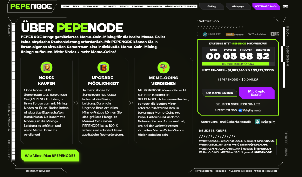 Während XRP zwischen Widerständen festhängt, entsteht im GameFi-Sektor neuer Hype durch das Projekt PepeNode ($PEPENODE), das kurz vor Ende seiner Presale-Phase bereits knapp 2 Millionen US-Dollar eingesammelt hat. Der Tokenpreis liegt derzeit bei 0,0011227 US-Dollar, bevor in Kürze die nächste Runde mit höherem Preis startet. Das innovative Konzept verwandelt klassisches Mining in ein spielerisches Wettbewerbsformat, bei dem Spieler virtuelle Mining-Farmen betreiben und ihre eigenen Knotenpunkte konfigurieren.