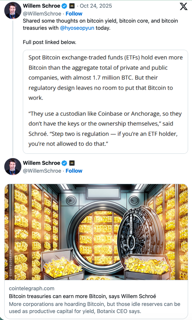 Die Aktien von Metaplanet, Strategy & Co. standen zuletzt wegen ihrer Bitcoin-Strategie an der Börse unter Druck. Investoren sind nicht mehr bereit, ein Premium auf den NAV der Vehikel zu bezahlen, was zu einer kritischen Situation für die Unternehmen führt, da dadurch Kapitalerhöhungen unattraktiv werden und die BTC-Akkumulationsstrategie nicht mehr fortgesetzt werden kann. Willem Schroé, Gründer und CEO des Bitcoin-Ertragsnetzwerks Botanix Labs, sieht jedoch noch eine Möglichkeit zur Rettung für die Unternehmen durch neue Ertragsmöglichkeiten.