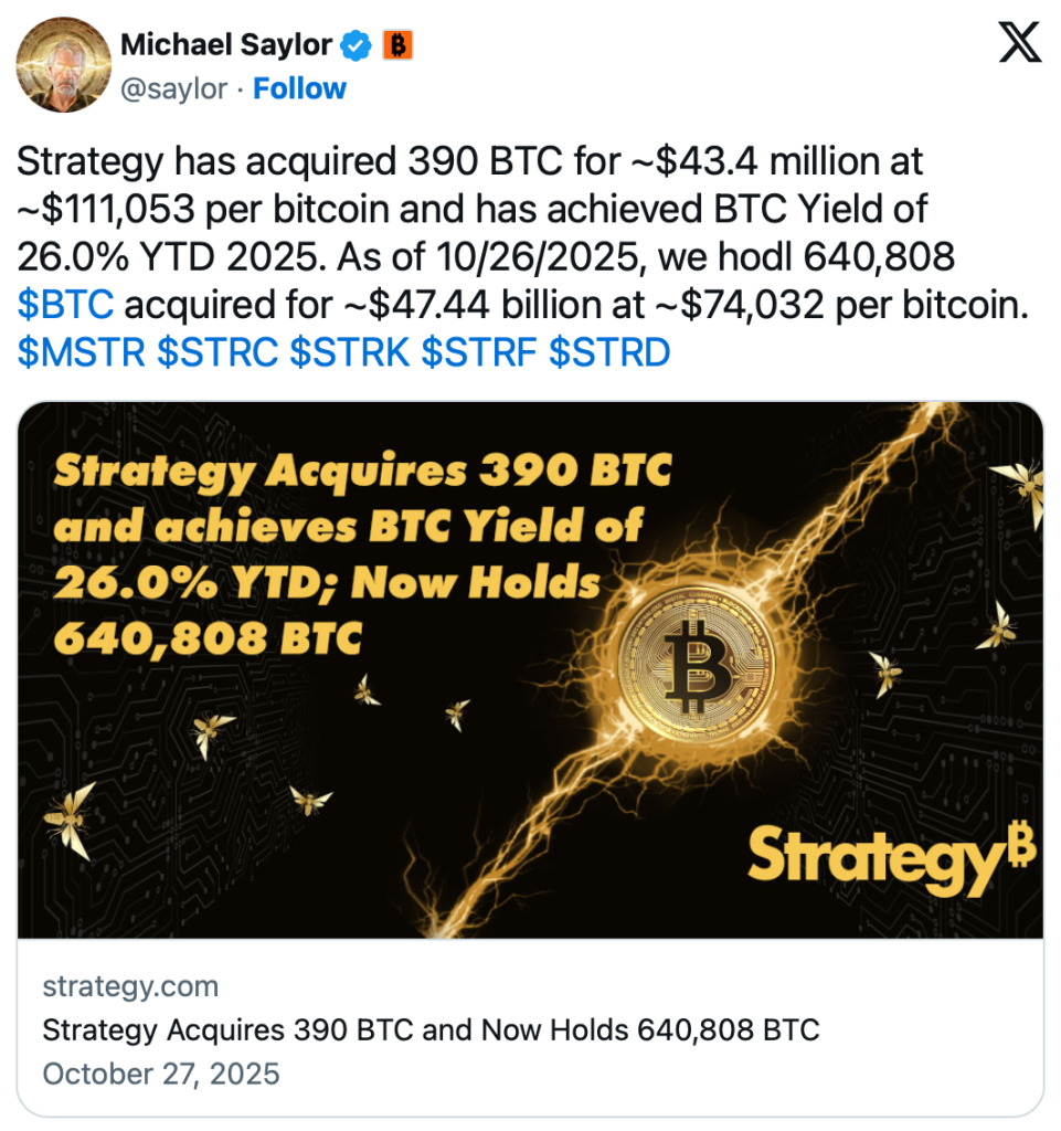 Strategy setzt seine Akkumulationsstrategie dennoch fort und erwarb in der vergangenen Woche 390 Bitcoin zu einem mittleren Preis von 111.053 US-Dollar. Dies erhöht die Bestände der Holding auf 640.808 Bitcoins, die zu einem durchschnittlichen Kaufpreis von etwa 74.000 US-Dollar erworben wurden. Strategy hält inzwischen mehr als drei Prozent aller jemals verfügbaren Bitcoins und mehr Anteile als alle anderen Krypto-Holding-Unternehmen zusammen.