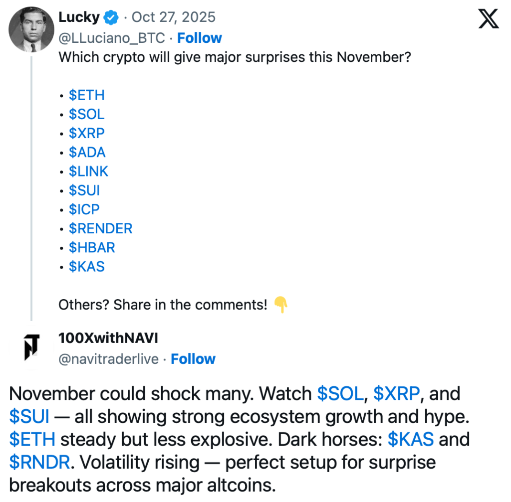 Mit dem Ende des Oktobers 2025 ist der Kryptowährungsbereich voller Erwartungen. Bitcoins kontinuierliche Bewegung über seinen 100-Tage-Durchschnitt hat den Weg für Altcoins geebnet, den Marktführer zu übertreffen - nach der Genehmigung von ETFs und Blockchain-Upgrades. Experten betrachten den November als einen Monat des Ausbruchs, wobei ein Analyst ehrgeizige Ziele für Coins mit hohem Volumen zeichnet und erklärt, dass Zuflüsse in ETFs dazu führen könnten, dass Solana 300-500 US-Dollar und XRP 2,50-3,50 US-Dollar erreicht.