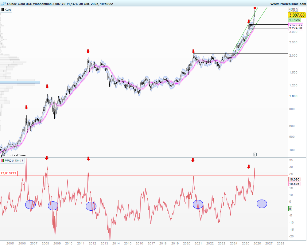 Je stärker die Kurse steigen und in eine Übertreibung übergehen, desto kräftiger fällt meist die anschließende Korrektur aus. Gold und Silber halten sich derzeit an diese Börsenweisheit und gönnen sich eine Verschnaufpause. Anders präsentiert sich der US-Aktienmarkt: Die Sorgen vor einer KI-Blase nehmen zu. Nvidia hat den Börsenwert inzwischen auf fünf Billionen US-Dollar gesteigert - etwa doppelt so viel wie alle 40 DAX-Unternehmen zusammen. Nach sieben positiven Monaten im Nasdaq 100 wächst die Unsicherheit, was auch die Reaktionen auf die jüngsten Quartalszahlen von Meta und Microsoft zeigen.