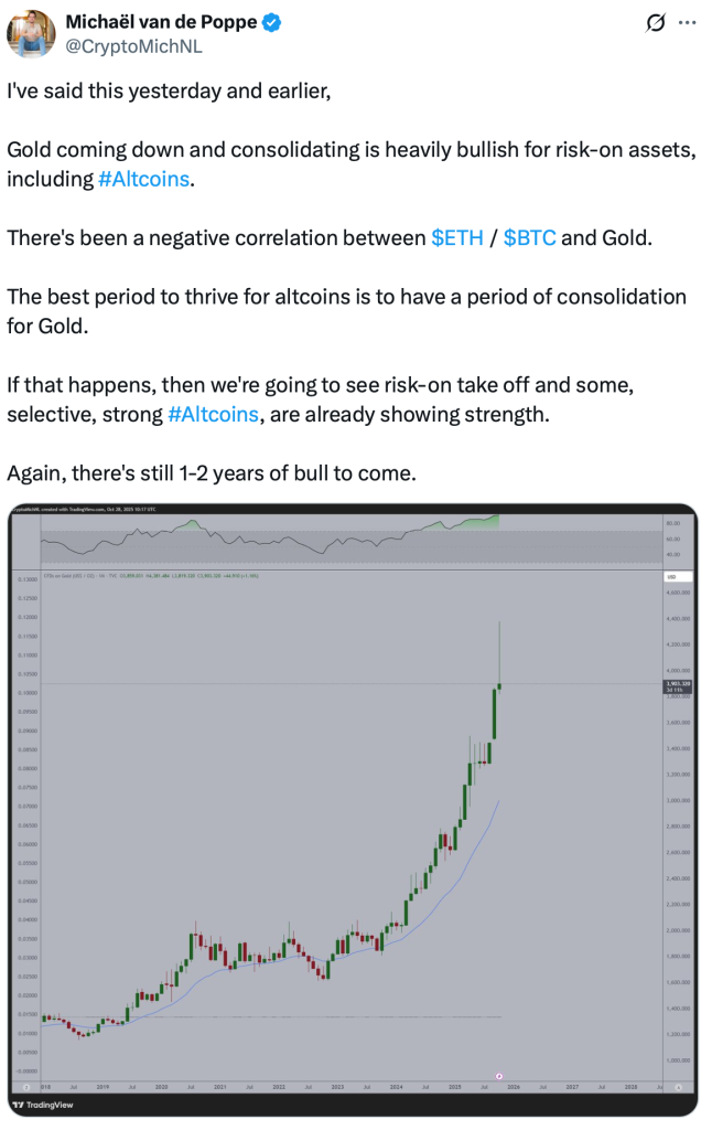 Zudem verwies er auf die historisch negative Korrelation zwischen Altcoins und Gold. Diese war zwar in der jüngeren Vergangenheit nicht gegeben, zeigt sich aber immer wieder und könnte nun erneut zum Tragen kommen. Van de Poppe ist optimistisch, dass der Risikoappetit der Investoren steigt und dies positiv für Altcoins sein könnte, möglicherweise sogar eine echte Altcoin Season einleiten würde.