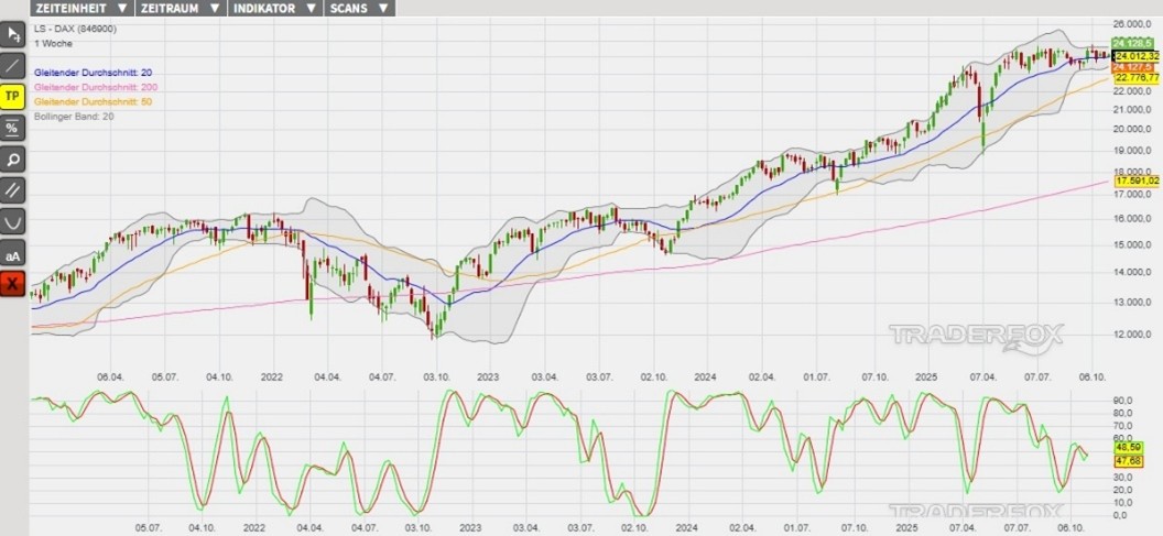 Wenn der DAX heute erneut Schwächetendenzen zeigen sollte, dann könnte die Kursentwicklung in Richtung des GD 50 tendieren. Der nachhaltige Kursrückgang unter den gleitenden Durchschnitt könnte ein belastendes Verkaufssignal erzeugen und die Kursentwicklung in Richtung des Tagestiefs vom 03. November bei 23.961 Punkten (Unterstützung 1) führen. Sofern dieses Supportniveau unterboten werden sollte, könnten sich die Bollinger-Bänder nach unten ausweiten. Hierdurch könnte der DAX wiederum in Richtung des lokalen Minimums vom 17. Oktober bei 23.669 Punkten (Unterstützung 2) tendieren. Als eine Anlagemöglichkeit in den DAX stehen verschiedene derivative Produkte zur Verfügung. Ein Beispiel ist der ENDLOS TURBO SHORT 27.117,96 OPEN END: BASISWERT DAX der DZ BANK (WKN: DU38XS)* mit einem Basispreis von 27.117,96 Punkten. Der Hebel liegt am 04.11.2025 um 07:00 Uhr bei 8,05. Das Short-Szenario ist hinfällig, wenn der DAX über die Marke von 24.384 Punkten (Widerstand 2) steigt. Bitte beachten Sie die Produktrisiken, welche unten im Dokument beschrieben sind.