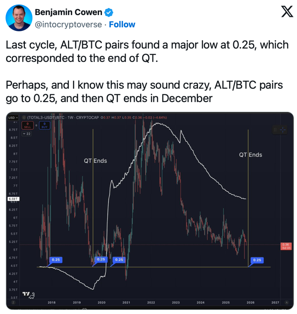Ein wichtiger Faktor dürfte das Streben der Vereinigten Staaten sein, zum führenden Standort der Kryptoindustrie zu werden. So äußerte Trump heute, dass sich "gerade jetzt" China auch "sehr groß" in Bitcoin und Kryptowährungen engagiert, er jedoch dafür Sorge tragen will, dass die USA die Nummer 1 bleiben. Somit ist mit förderlichen Regulierungen und mehr zu rechnen wie der strategischen Krypto-Reserve. Darüber hinaus wird das Quantitative Tightening von der Fed ab dem 1. Dezember eingestellt, was ebenfalls für mehr Liquidität in den Märkten sorgt.