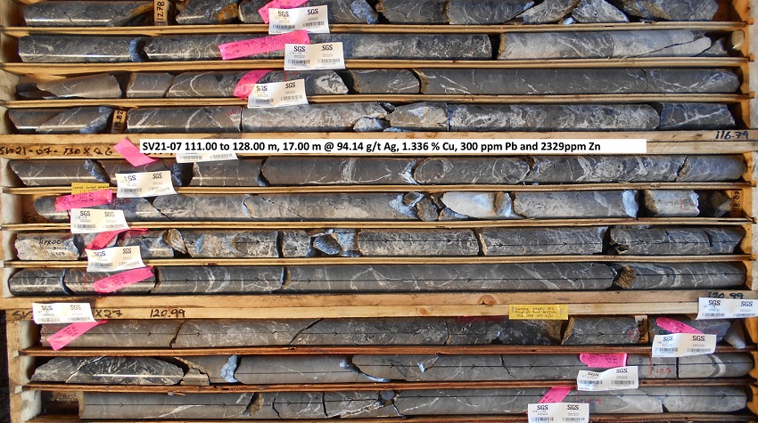 Bohrkerne u.a. von Bohrloch SV21-07 (17 m mit 94 g/t Silber und 1,34% Kupfer) Quelle: Supreme Critical Metals