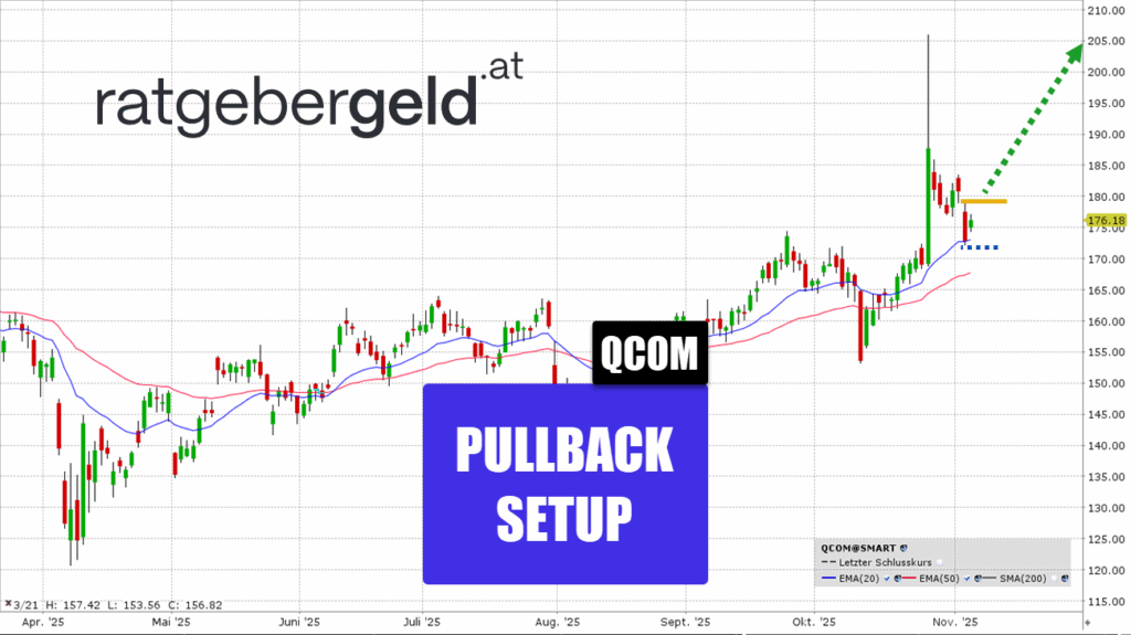 Qualcomm gilt als Schlüsselakteur im 5G-Ausbau und im Bereich der mobilen Prozessoren (Snapdragon). Das Unternehmen profitiert vom Wachstum in diesen Sektoren. Wichtige und unmittelbar kurstreibende Nachrichten, könnten die heute nach Börsenschluss bevorstehende Veröffentlichung der Ergebnisse für das vierte Quartal des Geschäftsjahres 2025 liefern. Das Pullback Setup ist charttechnisch bereit für eine Trendfortsetzung, aber die Quartalszahlen werden das endgültige Signal liefern, ob der Markt die fundamentale Story des Unternehmens weiterhin positiv bewertet.