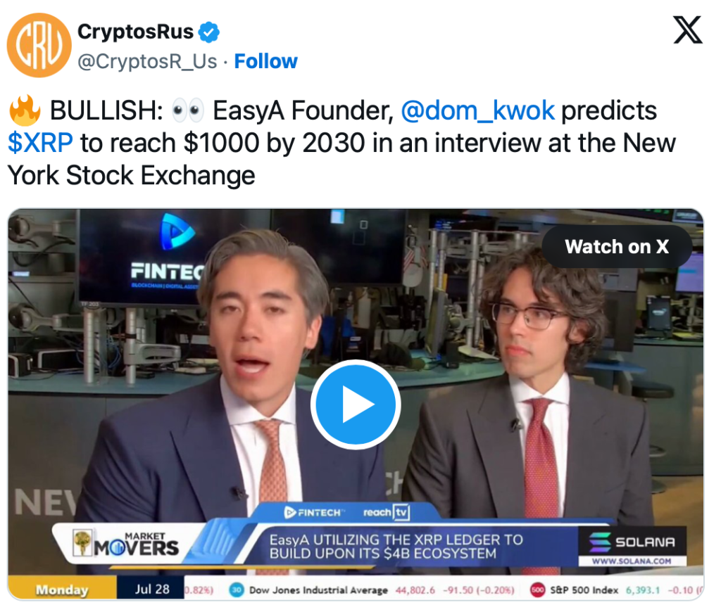 Doch es gibt auch gegenteilige Stimmen. Dom Kwok, ehemaliger Analyst bei Goldman Sachs und Mitbegründer der Bildungsplattform EasyA, prognostiziert einen XRP-Kurs von bis zu 1.000 US-Dollar bis Jahresende. Kwok sieht insbesondere institutionelle Investoren als künftige Treiber der Nachfrage.
