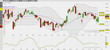 Am 04. November konnte sich der DAX nach einem Gap-Down mit einer grünen Tageskerze am unteren Bollinger-Band stabilisieren. Am Folgetag wurde erneut eine grüne Tageskerze am unteren Bollinger-Band geformt, welche ihren Schlusskurs über dem GD 50 markieren konnte. Dieser Etappenschritt hat zugleich dazu beigetragen, dass die grüne Signallinie der Slow Stochastik wieder über die rote Signallinie gestiegen ist. Somit wurden am Mittwoch zwei Kaufsignale getriggert, welche das bereits zuvor bestehende Kaufsignal des GD 200 noch verstärken. Der langfristige Aufwärtstrend könnte somit eine neue Aufwärtswelle in Richtung der Höchststände vorbereiten.