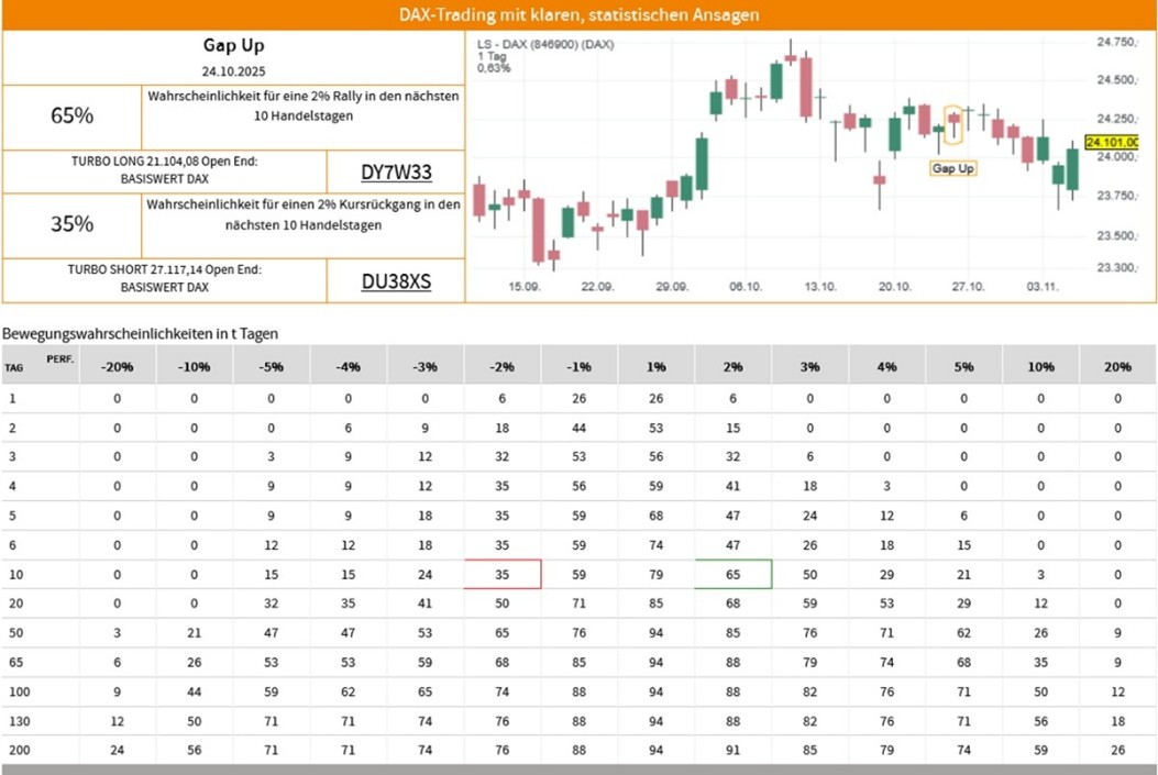 Die Erfolgswahrscheinlichkeiten für das Signal "Gap Up" beruhen auf einer historischen Auswertung des Signals auf den LS-DAX im Zeitraum vom 02.01.2000 bis zum 05.11.2025. Dabei wurden die folgenden Voreinstellungen und Filter vorgenommen: