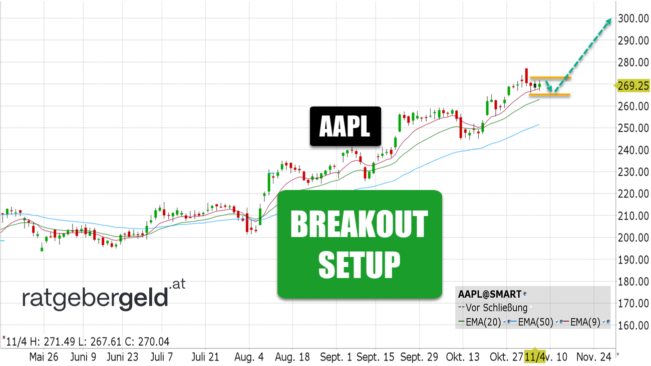 Apple hat wieder abgeliefert: Mit einem Quartalsumsatz von rund 102.5 Milliarden USD und einem Gewinn je Aktie von 1.85 USD übertrifft der Konzern deutlich die Erwartungen. Auch das Gesamtjahr glänzt mit einem Rekordumsatz von 416 Milliarden USD. Besonders stark läuft die Service-Sparte, die 28.8 Milliarden USD einbrachte - ein Plus von 15 Prozent gegenüber dem Vorjahr, angetrieben durch den App Store, Apple Music und iCloud. Der eigentliche Knaller ist aber die neue KI-Kooperation mit Google: Apples Sprachassistentin Siri soll künftig mit Googles KI-Modell "Gemini" aufgemöbelt werden. Der Start ist für Frühjahr 2026 geplant, und der Deal schlägt laut Bericht mit rund 1 Milliarden USD pro Jahr zu Buche. Ziel ist es, Apples Rückstand bei Künstlicher Intelligenz endlich aufzuholen. Trotz eines schwächeren China-Geschäfts zeigt sich CEO Tim Cook optimistisch und erwartet für ein Rekord-Weihnachtsquartal mit einem Umsatzwachstum von 10 Prozent bis 12 Prozent. Fazit: Sofern der Gesamtmarkt mitspielt, könnte das Signal zum Einstieg in die Jahresendrallye bei der Apple-Aktie bald kommen.