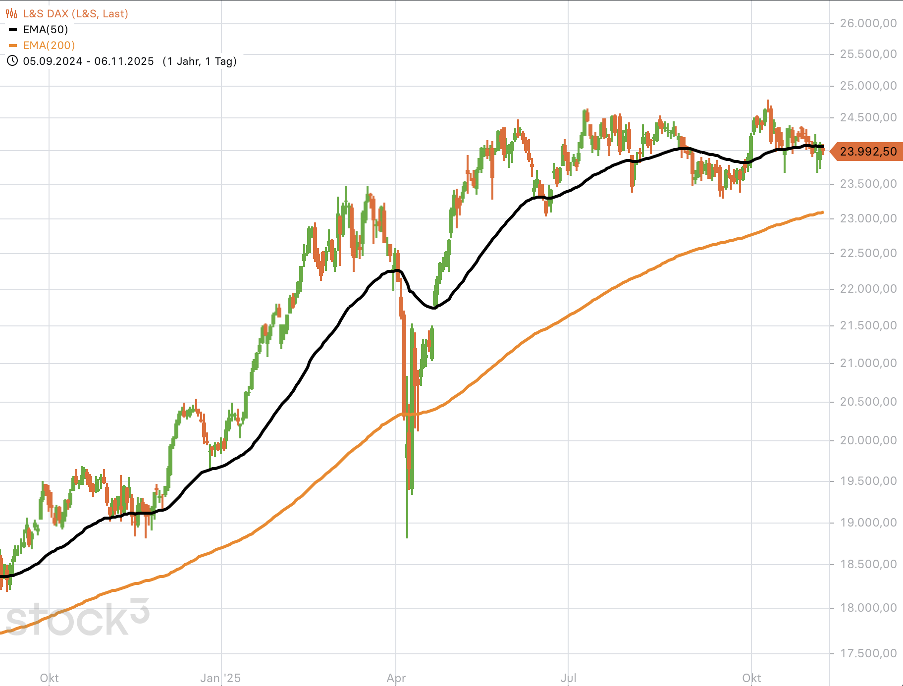 Nach den Verlusten vom Vortag haben die US-Börsen am Mittwoch wieder den Vorwärtsgang eingelegt. Im Blickpunkt standen vor allem die Daten des privaten Arbeitsmarktdienstleisters ADP, die signalisierten, dass die US-Privatwirtschaft im Oktober mehr Arbeitsplätze geschaffen hat als zuvor erwartet. Wegen des anhaltenden Shutdowns der Regierungsbehörden gibt es derzeit keine offiziellen Arbeitsmarktdaten. Der Dow Jones beendete den Handel mit einem Plus von 0,48 % bei 47.311 Punkten, während der marktbreitere S&P 500 um 0,37 % auf 6.796 Punkte zulegte. Der Technologieindex Nasdaq 100 toppte das noch und schloss 0,72 % höher bei 25.620 Punkten. Nach der Kurserholung vom Vortag schwächelt der Dax heute Morgen im frühen Handel und rutschte unter die Marke von 24.000 Punkten. Aktuell notiert der deutsche Leitindex bei 29.940 rund 0,4 % im Minus.