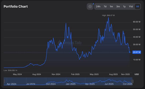 Bereits im vergangenen Jahr des "Memecoin-Superzyklus" ist Mahmudov dadurch berühmt geworden, dass er die Marktwenden frühzeitig prognostiziert hatte. Aber auch jetzt lässt sich seine bullisch Haltung an dem laut DropsTab hohen Bestand von Memetoken erkennen, wobei er derzeit auf unrealisierten Gewinnen in Höhe von 19,2 Mio. USD sitzt, während es zu Jahresbeginn noch mehr als 60 Mio. USD waren.