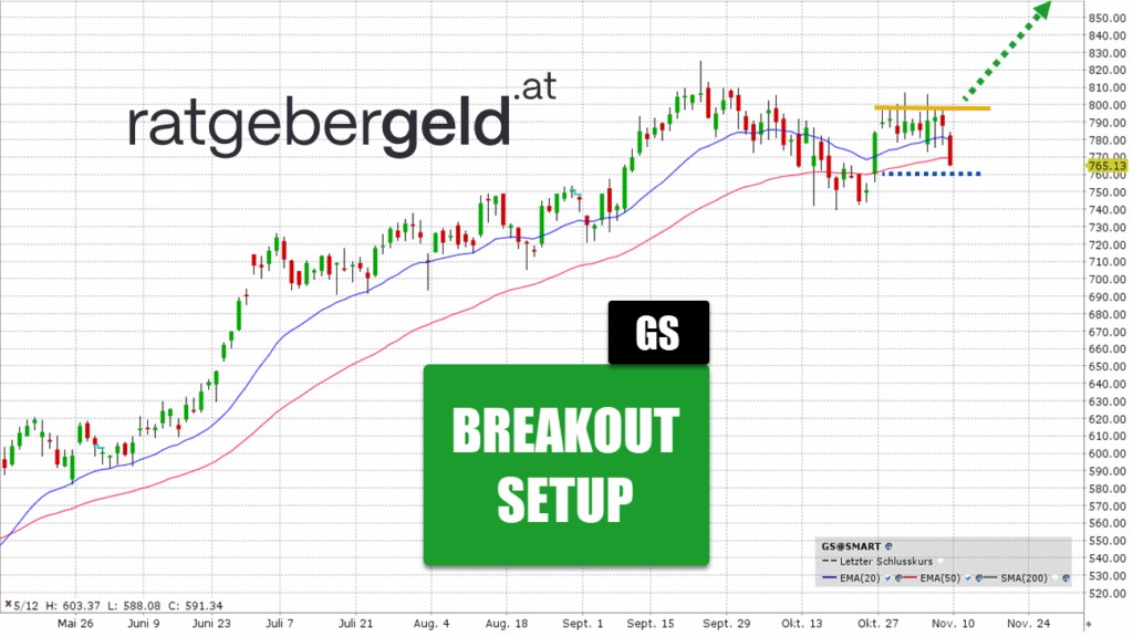 Die Aktie von Goldman Sachs befindet sich in einer starken Aufwärtsbewegung. Im September wurde ein neues Allzeithoch bei 825,25 USD erreicht. Dies signalisierte eine anhaltend hohe Kaufbereitschaft. Danach folgte ein Pullback zum EMA 50. Nach einem bullischen Impuls im Oktober ging es seitwärts weiter.