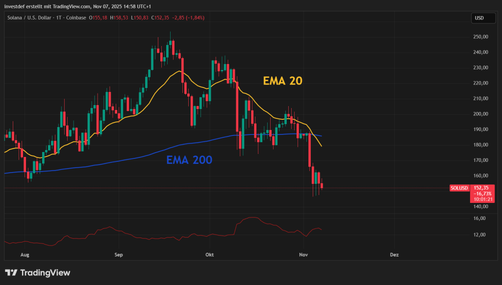 Seit Mitte September fiel der Kurs von 253,61 US-Dollar auf aktuell rund 152,52 US-Dollar - ein Rückgang von knapp 39 % in weniger als zwei Monaten. Besonders besorgniserregend: Solana hat die wichtigsten gleitenden Durchschnitte (EMA 20, 50 und 200) nach unten durchbrochen.