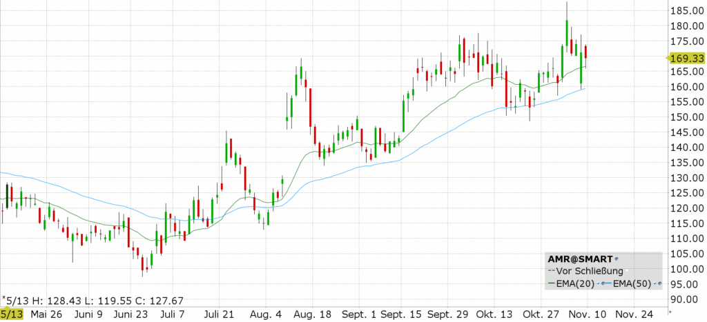 Alpha Metallurgical Resources mit Sitz in Tennessee betreibt Bergwerke in Virginia und West Virginia. Das Unternehmen beliefert Stahlhersteller weltweit mit hochwertigen metallurgischen Kohleprodukten. Dank umfangreicher Lagerstätten und hervorragender Hafenanbindung garantiert Alpha eine verlässliche Versorgung der Stahlindustrie. 2024 gab es auch hier Verluste. Die Kursentwicklung mit einem Plus von rund 45 Prozent in den vergangenen sechs Monaten mit einer Orientierung an den gleitenden Durchschnitten ist jedoch gleichfalls positiv.