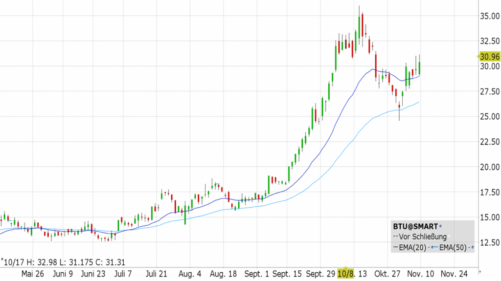 Peabody Energy - früher als Peabody Coal Company bekannt - ist der größte privatwirtschaftliche Kohleförderer weltweit und hat seinen Hauptsitz in St. Louis, Missouri. Das Unternehmen baut sowohl Kraftwerks- als auch Kokskohle ab. Im April 2016 musste Peabody Insolvenz nach Chapter 11 des US-Insolvenzrechts anmelden. Dabei wurde bekannt, dass der Konzern aktiv an der organisierten Leugnung des Klimawandels beteiligt war. Nach einem Rekordjahr 2022 sind die Geschäftszahlen inzwischen rückläufig, und für das laufende Jahr rechnet man mit einem Verlust. Der Aktienkurs zeigt jedoch im bisherigen Jahresverlauf ein Plus von rund 105 Prozent, gefolgt von einer Korrektur nach dem jüngsten Pivot-Hoch und einer anschließenden Stabilisierung über den gleitenden Durchschnitten.