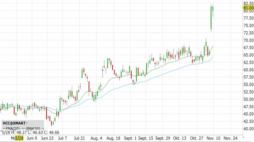 Warrior Met Coal ist auf metallurgische Kohle spezialisiert Die Aktie hat in der Vergangenheit aufgrund von Schwankungen bei Kohlepreisen und globaler Stahlnachfrage starke Volatilität gezeigt. Die jüngsten Earnings lagen allerdings deutlich über den Erwartungen, was sich mit dem Gap Up im Chart zeigt.