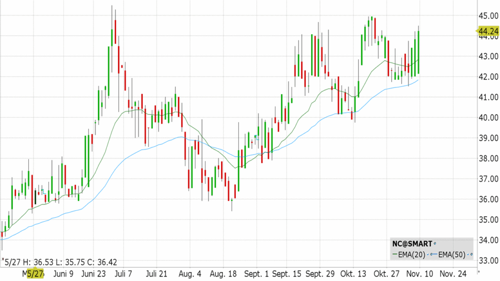 NACCO Industries ist eine US-amerikanische Holding, deren Kernbeteiligung der Kohleförderer North American Coal (NACoal) ist. Bis in die 2010er Jahre agierte das Unternehmen als breit diversifizierter Mischkonzern. In den letzten Jahren schwankten die Ergebnisse stark: Aktuell zeigen die Quartalszahlen zwar Umsatzwachstum, der Gewinn liegt jedoch unter dem Vorjahresniveau. Die Aktie legte in den vergangenen sechs Monaten rund 30?Prozent zu. Spannend wird es bei 45?USD, wo eine Widerstandslinie den Kursanstieg zu