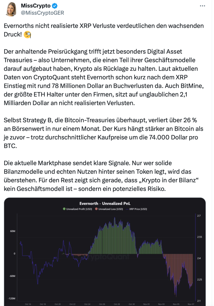 Allerdings ist die Strategie bereits früh auf die Probe gestellt worden. Durch den jüngsten Preisrückgang von XRP auf rund 2,25 US-Dollar liegt Evernorth laut CryptoQuant aktuell bei rund 78 Millionen US-Dollar an nicht realisierten Verlusten. Diese Buchverluste könnten realisiert werden, sollte das Unternehmen gezwungen sein, Bestände zu liquidieren.