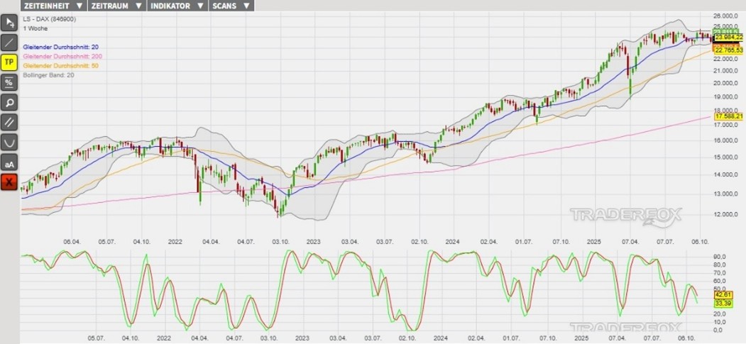Der DAX hat an den letzten beiden Handelstagen lange, rote Tageskerzen geformt. Sollte sich die Kursschwäche ausweiten, dann könnte das Unterschreiten des Tagestiefs vom 07. November bei 23.449 Punkten (Unterstützung 1) den Index zum GD 200 und dem Tagestief vom 25. September bei 23.376 Punkten (Unterstützung 2) führen. Sollte die Supportzone unterboten werden, dann würde ein mittelfristig relevantes Verkaufssignal erzeugt werden. Als eine Anlagemöglichkeit in den DAX stehen verschiedene derivative Produkte zur Verfügung. Ein Beispiel ist der ENDLOS TURBO SHORT 26.827,45 OPEN END: BASISWERT DAX der DZ BANK (WKN: DU01C0)* mit einem Basispreis von 26.827,45 Punkten. Der Hebel liegt am 10.11.2025 um 07:00 Uhr bei 7,72. Das Short-Szenario ist hinfällig, wenn der DAX über die Marke von 24.054 Punkten (Widerstand 2) steigt. Bitte beachten Sie die Produktrisiken, welche unten im Dokument beschrieben sind.